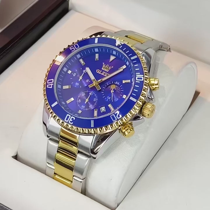 OLEVS Watches Top Luxury Brand Original Water Resistant Chronograph Stainless Steel Moon Phase Date Rotary Dial